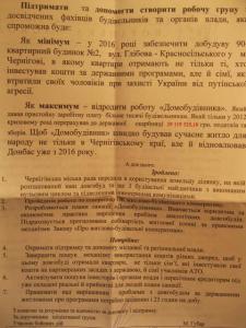 Активисты во главе с участником боевых действий на Востоке Украины Николаем Губарем побывали в облгосадминистрации, у городского головы Чернигова, в черниговском региональном управлении Государственного фонда содействия молодежному жилищному строительству и даже выступили на второй сессии областного совета.