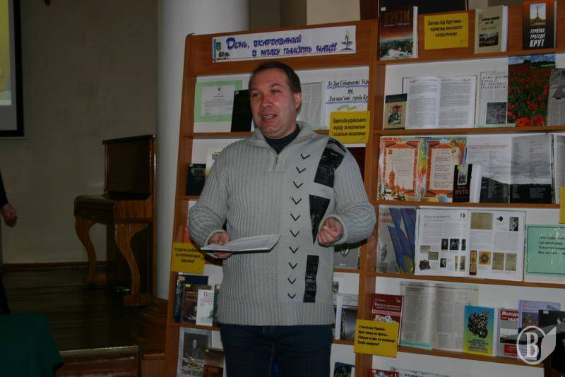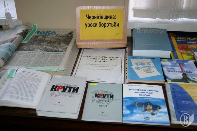 Виктория Примак, модератор мероприятия, ведущий библиотекарь отдела документов по гуманитарным наукам Черниговской областной универсальной научной библиотеки им. В. Г. Короленко представила коллективный пересмотр литературы под названием «День, вчеканенный в живую память нации» ко дню Соборности Украины и Дню памяти Героев Крут. Презентованные всеукраинские и краеведческие научные, научно-популярные и документально публицистические издания и публикации были размещены тематически: о первой независимости Украины и соединении УНР из ЗУНР, Украинской революции 1917–1921 гг., бой под Крутами, украинской национально-освободительной борьбе в 20-ом веке, возобновление собственного государства в 1989–1991 гг. и современной отечественной оборонной войне.