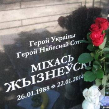 Траурная корзина с сине-желтыми цветами и надписью на ленте тех же цветов: «Герою Небесной Сотни Михаилу Жизневскому» - от украинского посольства в Минске.