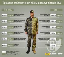 С 2016 года солдат-контрактник в тылу получает 7000 грн, младший сержант — 8000 грн, лейтенант — 9500 грн. Зарплаты военных в зоне АТО, на линии столкновения, по меньшей мере в полтора раза большие и стартуют с 10300 грн. К тому же, военные имеют право на дополнительные денежные выплаты: подъемные, помощь на оздоровление и тому подобное.