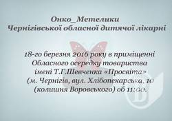 18-го марта 2016 года в помещении Областной ячейки общества имени Т. Г. Шевченко «Просвита» (г.Чернигов, ул. Хлебопекарская, 10 (бывшая Воровского) в 11:00 состоится пресс-конференция «Онко_Бабочки Черниговской областной больницы».