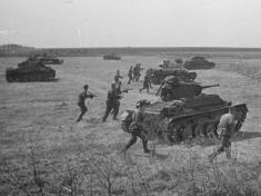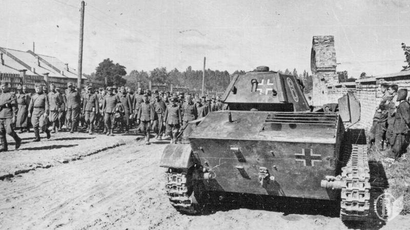 Колонная немецких военнопленных проходят мимо подбитого захваченного ранее Вермахтом легкого танка Т-70 советского производства. Под стенкой дело стоят советские танкисты, которые, вероятнее всего, пытаются восстановить танк, район Киева, весна 1944 года
