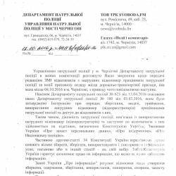 Управление патрульной полиции Чернигова в ответ на запрос редакций Svoboda.fm и «Черниговщина: события и комментарии» отказалось предоставлять видеозаписи из нагрудных камер полицейских, которые оформляли протокол на месте ДТП головы областного совета Игоря Вдовенко и копию протокола обзора места ДТП.