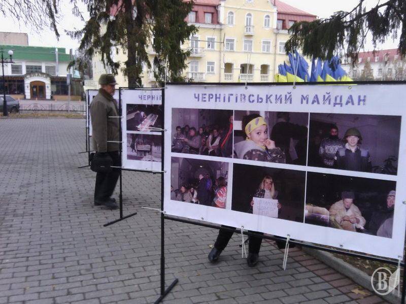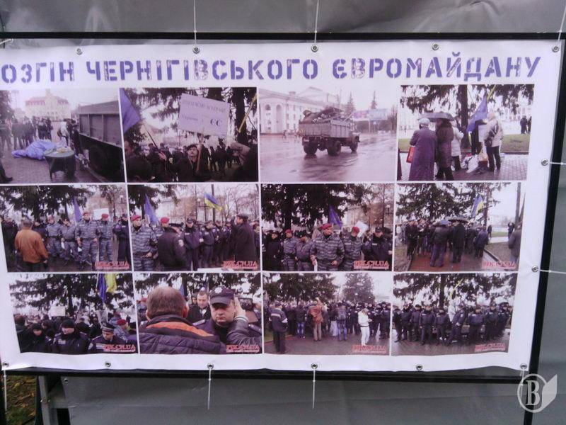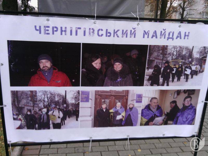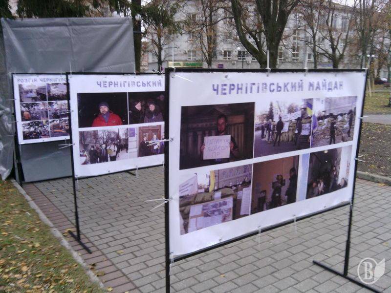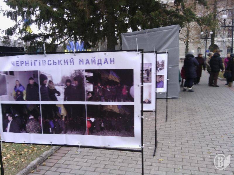 Поруч встановлено стенди фотовиставки «Чернігівський Майдан» зі світлинами, зробленими наприкінці 2013- на початку 2014 років. На них – ті, хто робив Євромайдан у місті над Десною, хто їм допомагав і хто протидіяв. В окремому наметі – продають сувеніри для патріотів.