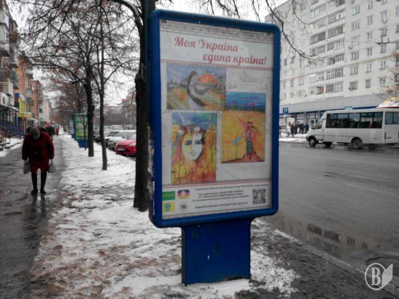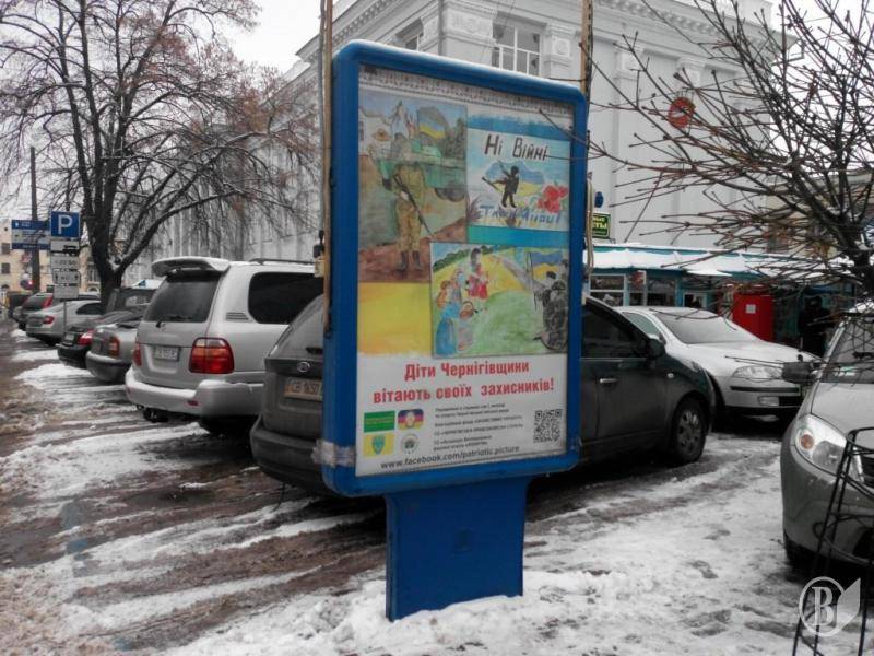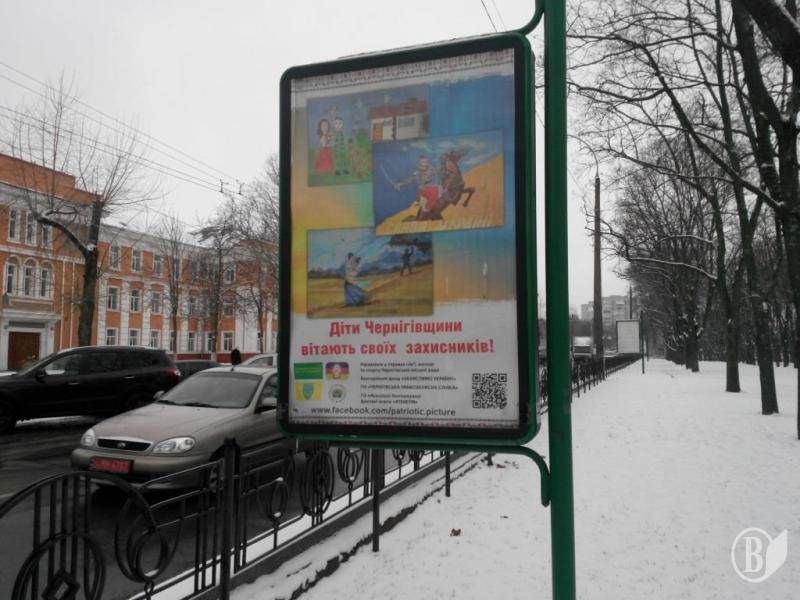 На рекламних площах розміщені постери з колажами із малюнків патріотичного та військово-патріотичного напрямку з двома загальними гаслами «Діти Чернігівщини вітають своїх захисників!» та «Моя Україна – єдина країна!».