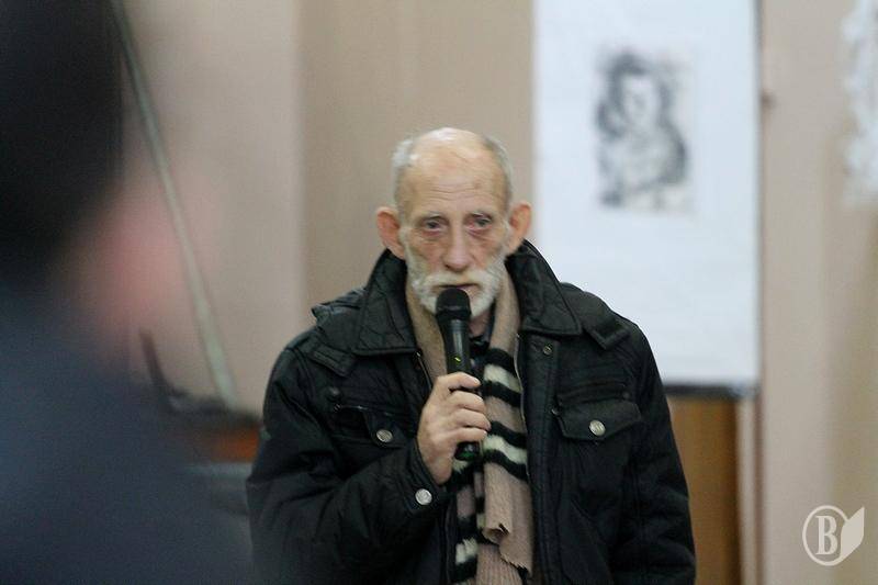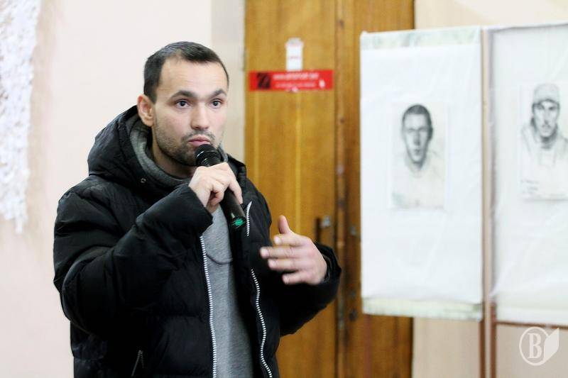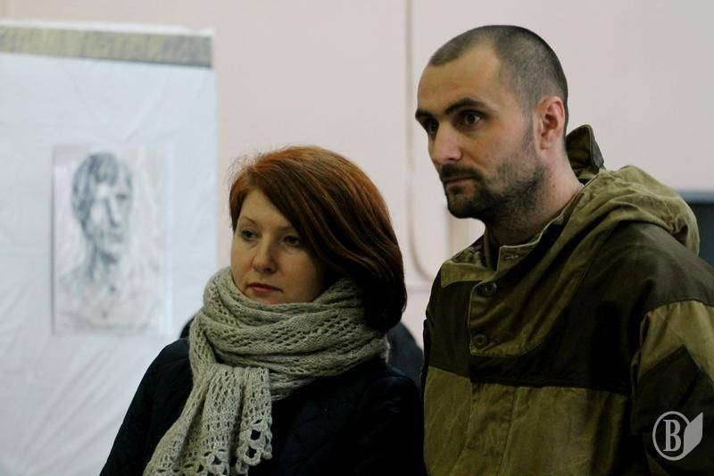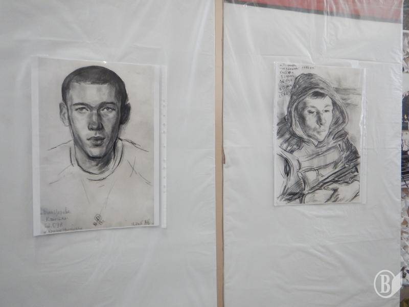 Бук розповів про художника, який малював олівцем всі портрети, які представлені на виставці. Показав фотопортрет цього художника - він сидить на зупинці в Пісках під Донецьком.