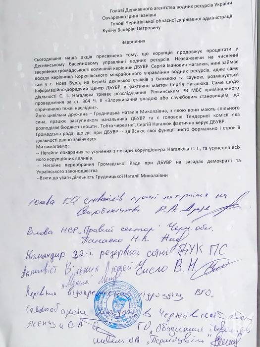 Незважаючи на численні звернення громадськості, колишній керівник ДБУВР Сергій Іванович Нагалюк нині займає посаду керівника Корюківського міжрайонного управління водних ресурсів.
