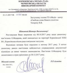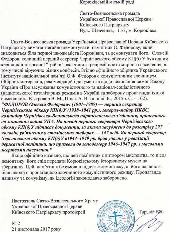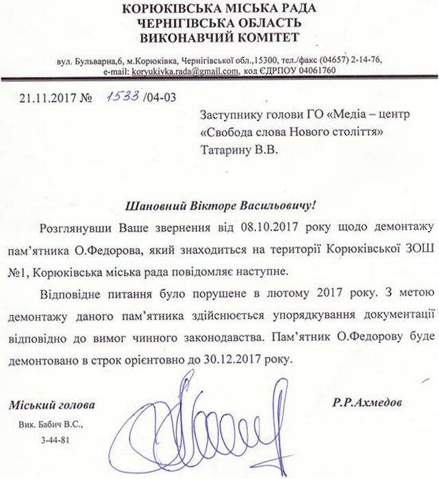 Міська рада райцентру Корюківка, що на Чернігівщині, 21 листопада знову отримала звернення щодо статуї генерала НКВС Олексія Федорова, яка стоїть на території школи №1.