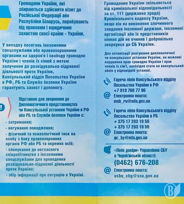 Тому Управління СБ України в Чернігівській області звертається до громадян, які перетинають кордон з Російською Федерацією або Республікою Білорусь і нагадує про те, що під час перебування за кордоном вони залишаються під правовим захистом своєї держави.