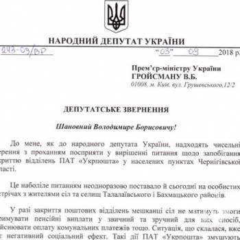 «За результатами моєї сьогоднішньої робочої поїздки до Талалаївського та Бахмацького районів Чернігівщини звернувся до Прем'єр-міністра України Володимира Гройсмана з проханням вжити невідкладних заходів для припинення закриття поштових відділень у населених пунктах області».