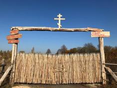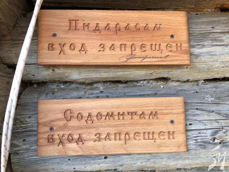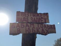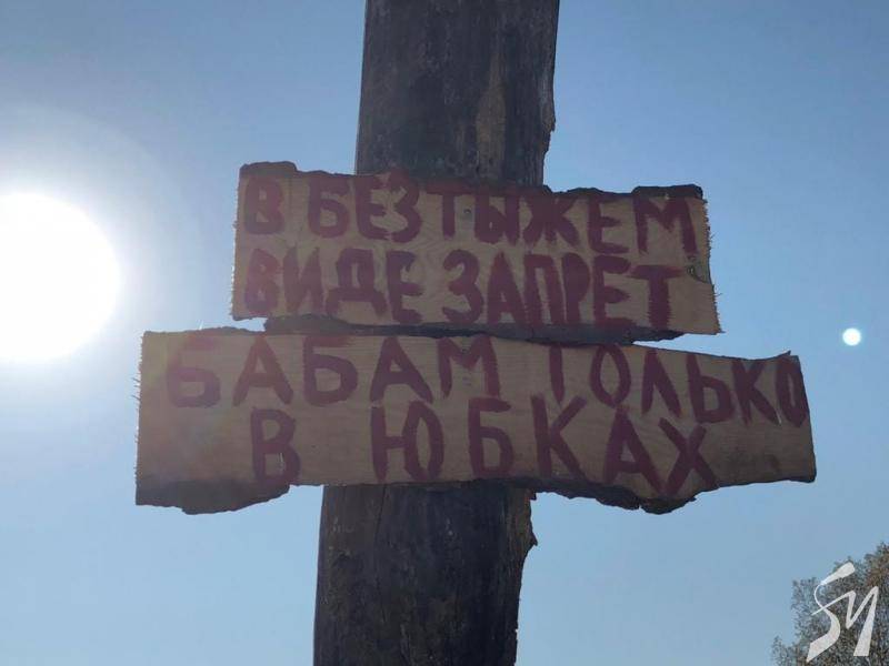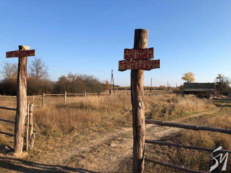 Село стало більше схоже на лісове поселення із російського фільму “Охота на пиранью”: дерев’яний частокіл, хрести, таблички з нецензурними написами російською мовою.