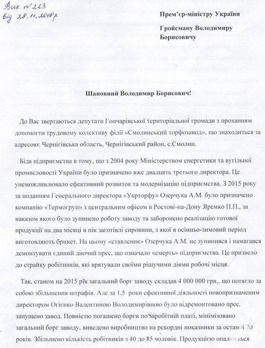 Прем’єра просять почути думку громади та трудового колективу «Смолинського торфозаводу» філії ДП «Чернігівторф» і покласти край свавіллю керівника «Укрторфу» Андрія Озерчука, з подачі якого відбувається рейдерське захоплення торфовидобувної галузі Чернігівщини.