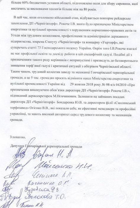Представники Гончарівської ОТГ, яка нараховує 5 тисяч мешканців, а адміністративний центр якої розміщується у військовому містечку, стурбовані тим, що під час воєнного стану з боку незаконно призначеного в.о.директора ДП «Чернігівторф» Рокоче І.В. відбуваються дії, які носять рейдерський характер. Депутати просять Главу Уряду Володимира Гройсмана втрутитись в ситуацію та скасувати незаконний наказ міністерства.