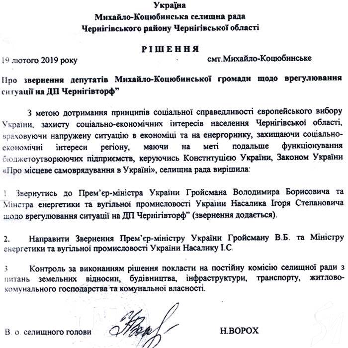 Михайло-Коцюбинська селищна рада звернулася до урядового керівництва з проханням врегулювати ситуацію на державному підприємстві «Чернігівторф».