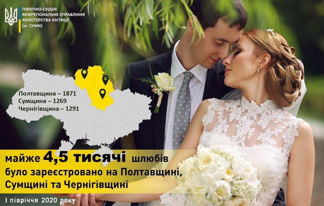 «Бажання доповнювати один одного допомогло молодятам утворити з початку 2020 року майже 4,5 тисячі родини, зокрема майже 2 тисячі шлюбів було зареєстровано на Полтавщині, понад 1,2 тисячі шлюбів – на Сумщині та більше 1,2 сімей створили на Чернігівщині. З обачливістю та смаком українці обирають свої особливі дати та вподобають «красиві» комбінації чисел, до речі, які також припали й на літню пору року» , – зазначила Ірина Свистун, начальник Північно-Східного міжрегіонального управління Міністерства юстиції (м. Суми).