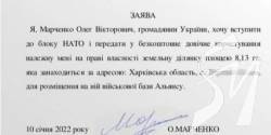Харків'янин Олег Марченко написав заяву на ім'я генерального секретаря НАТО Єнса Столтенберга, в якій пропонує свою земельну ділянку для розміщення військової бази Альянсу. Відповідна фотокопія з'явилася у телеграм-каналі Оперативний ЗСУ.