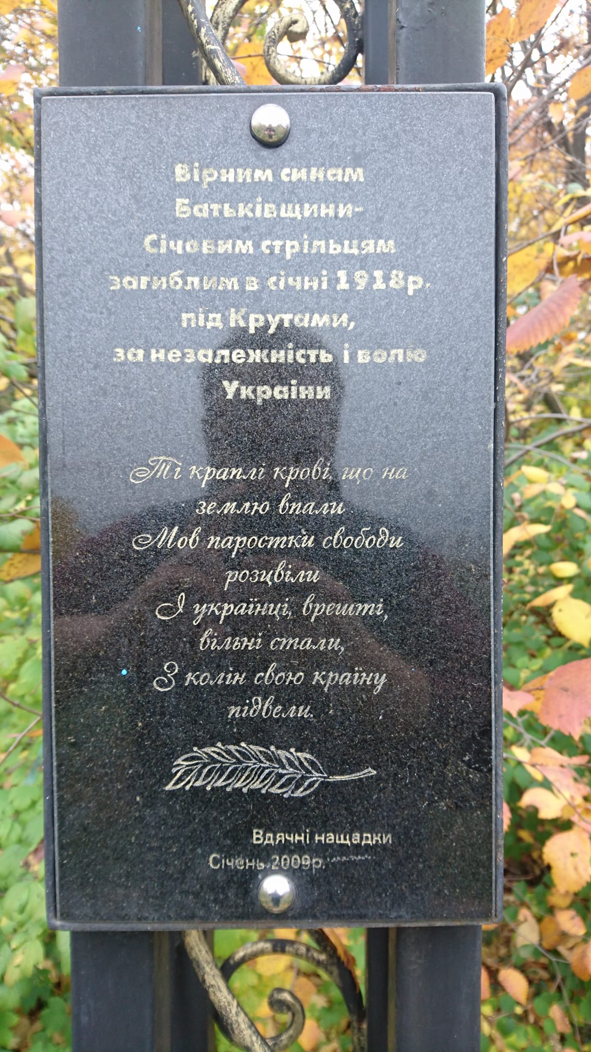 На Замковій горі у Києві, на території колишнього, сьогодні закинутого і захаращеного Флорівського цвинтаря, стоїть високий чорний металевий хрест. Як сповішає табличка, споруджено його 2009 р. на честь Січових стрільців, загиблих під Крутами у січні 1918 р. Думав, що то типова міська легенда, адже в уяві людей всі полеглі обов'язково мають бути січовими стрільцями, і загинути вони могли тільки під Крутами. Але вияснилося, що, як завжди, "диму без вогню не буває". На Флорівському цвинтарі таки похований, принаймні, один юний гімназист-доброволець Микола Абросімов. Правда, загинув він 6(19) січня 1918 р., тобто за 10 днів до крутянського бою. Загинув на станції Макошине, будучи у складі екіпажу українського панцерного потяга "Вільна Україна". Серед загиблих знаємо ще кілька імен київських гімназистів, зокрема, двох євреїв за національністю. Це - Ісидор Троцький та Олександр Жук, котрих, ймовірно, поховали на єврейському цвинтарі на Лук'янівці.