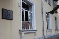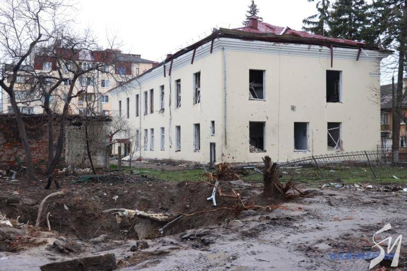 У будівлі вибиті шибки, уламками снарядів посічено стіни, пошкоджено дах. Поруч зі спорудою – вирва від прильоту ворожого снаряда.