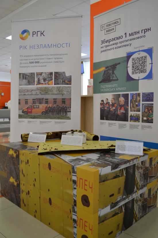 Також на стендах представлені фотографії, на яких можна побачити пошкодження газових мереж та газового обладнання, роботу фахівців буквально під обстрілами, та відновлення розподілу природного газу.
