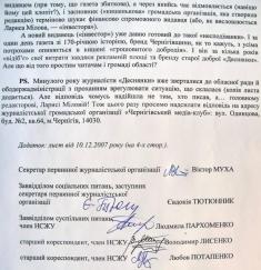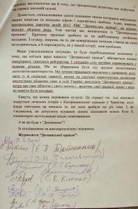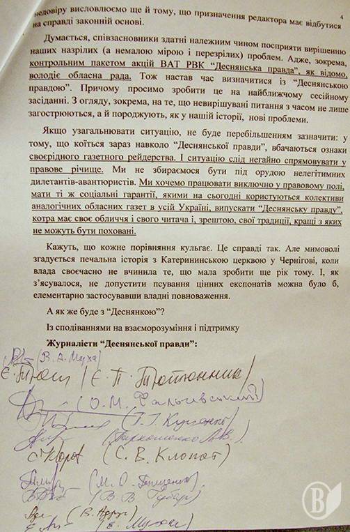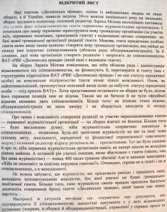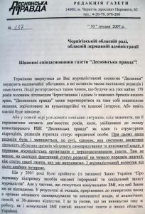 P.S. Минулого року журналісти «Деснянки» вже зверталися до обласної ради й облдержадміністрації з проханням врегулювати ситуацію, що склалася (копія листа додається). Але відповідь чомусь надійшла не тим, хто писав, а... головному редакторові, Ларисі Міловій!