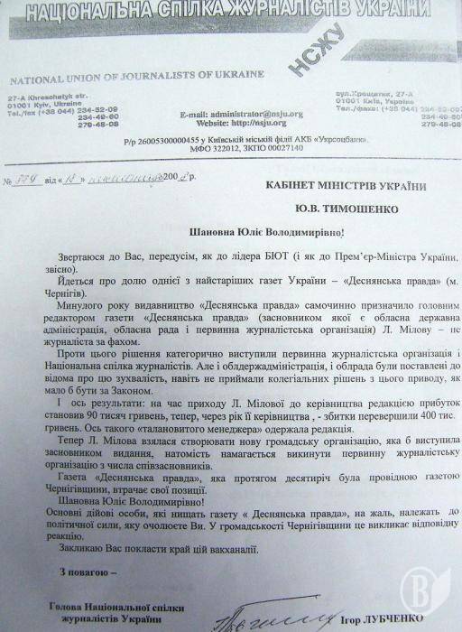 «Звертаюся до Вас, передусім, як до лідера БЮТ (і як до Прем'єр-Міністра України, звісно), - зазначає голова НСЖУ у листі до Юлії Тимошенко. І підкреслює: - Йдеться про долю однієї з найстаріших газет України - «Деснянська правда» (м. Чернігів).»