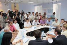 Народу в залі було не проштовхнутися з причини небувалої кількості журналістів, фотографів та операторів, як місцевих так і заїжджих. На відміну від штовханини серед ЗМІ, учасники обговорення за круглим столом не поспішали займати свої місця.