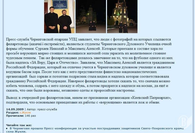 На официальном сайте Черниговской епархии УПЦ МП появились интересные материалы. В частности, рассказывая о неудачной попытке захватить в селе Жукля Покровскую церковь, общество которой перешло в Киевский патриархат, сайт говорит: