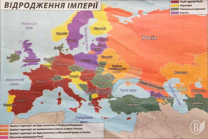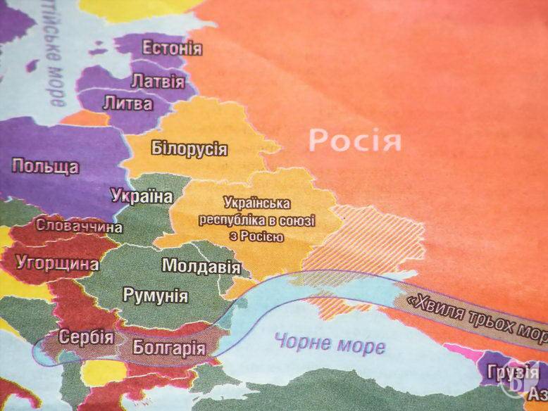 Также под заглавием «Прогноз на завтра; Возрождение империи» размещена политическая карта Европы от журнала «Лимес». Карта эта не обещает ничего хорошего для Украины, а именно - Украина делится на три части.