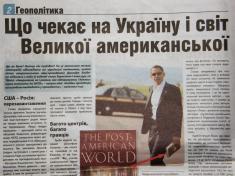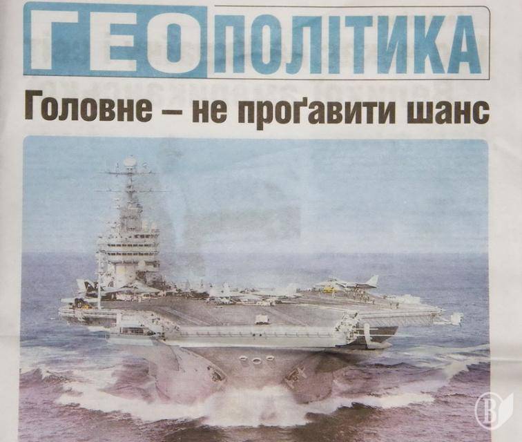 Проникаются авторы издания будущим Украины. На первой странице под изображение авианосца размещена выдержка из выступления лидера «Фронта Изменений» Арсения Яценюка. Господин Яценюк рассказывает об изменениях в геополитической карте мира и месте Украины в этой измененной карте.