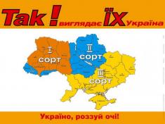 Раздел карты Украины на части известен нам еще с прошлых выборов Президента – в 2004 году. В виде открытки с Украиной, разделенной на сорта. Тогда некоторые политические силы связывали распространение открытки со штабом кандидата на должность Президента от Партии регионов.