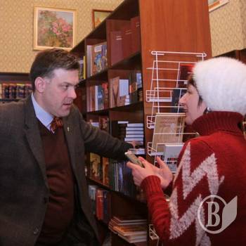 На фото: Олег Тягнибок у КМЦ "Інтермеццо" розмовляє з кореспондентом "Укрінформу"