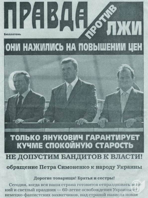 Сегодня бывший зэк, а ныне премьер Янукович хочет купить нас дотациями к пенсиям. Украв у страны и ее граждан миллиарды миллиардов, он по-хамски кидает ветеранам войны и труда жалкие гроши, выдавая их за щедрый подарок правительства. Кровь, пот и мозоли целого поколения бандитская власть оценила в несколько десятков гривен. Он бросает им эти жалкие копейки и ждет благодарности, чтобы потом забрать эти выплаты обратно и наказать людей за доверчивость. И даже тут он не удержался от циничной попытки заработать очередные миллиарды на бедствиях несчастных ветеранов, поскольку тут же поднял цены на продукты. И мы еще должны отблагодарить его за это издевательство?