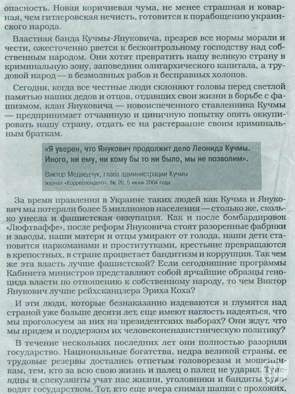 Сегодня, когда все честные люди склоняют головы перед светлой памятью наших дедов и отцов, отдавших свои жизни в борьбе с фашизмом, клан Януковича — новоиспеченного ставленника Кучмы — предпринимает отчаянную и циничную попытку опять оккупировать нашу страну, отдать ее на растерзание своим криминальным браткам.