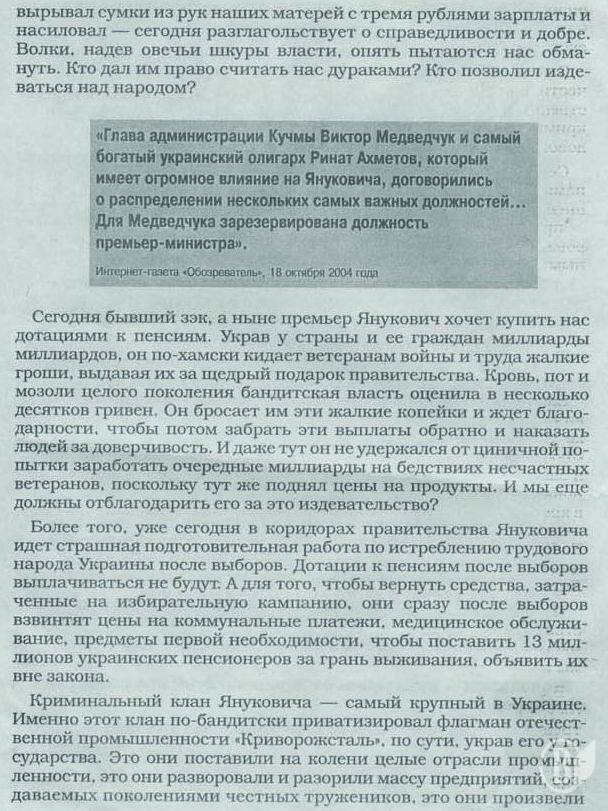 Властная банда Кучмы-Януковича, презрев все нормы морали и чести, ожесточенно рвется к бесконтрольному господству над собственным народом. Они хотят превратить нашу великую страну в криминальную зону, заповедник олигархического капитала, а трудовой народ — в безмолвных рабов и бесправных холопов.