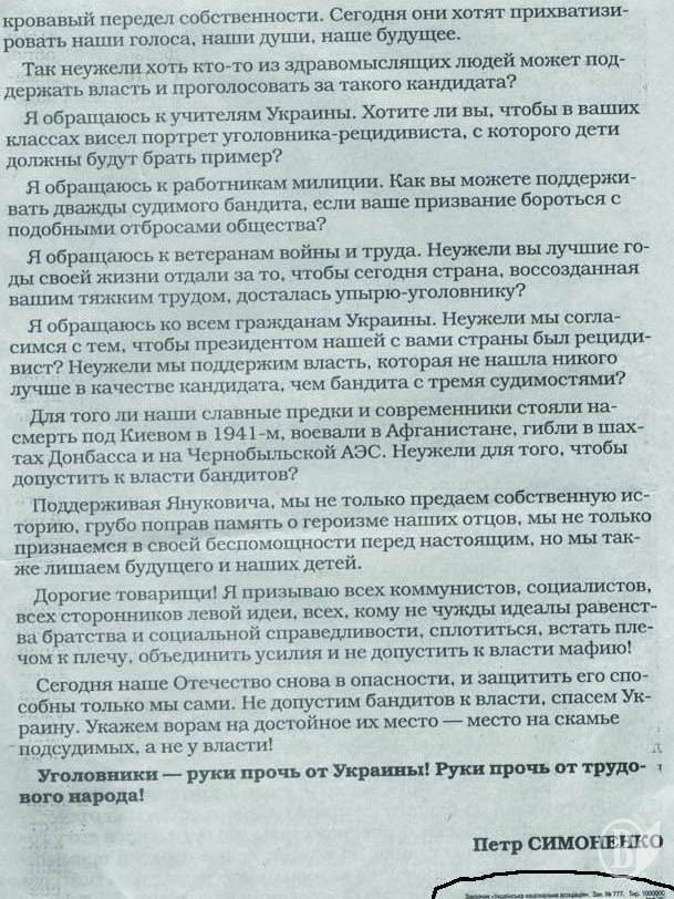 Я обращаюсь ко всем гражданам Украины. Неужели мы согласимся с тем, чтобы президентом нашей с вами страны был рецидивист? Неужели мы поддержим власть, которая не нашла никого лучше в качестве кандидата, чем бандита с тремя судимостями?