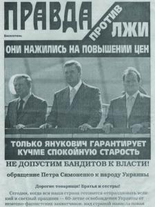 Криминальный клан Януковича — самый крупный в Украине. Именно этот клан по-бандитски приватизировал флагман отечественной промышленности «Криворожсталь», по сути, украв его у государства. Это они поставили на колени целые отрасли промышленности, это они разворовали и разорили массу предприятий, создаваемых поколениями честных тружеников, это они произвели кровавый передел собственности. Сегодня они хотят прихватизировать наши голоса, наши души, наше будущее.