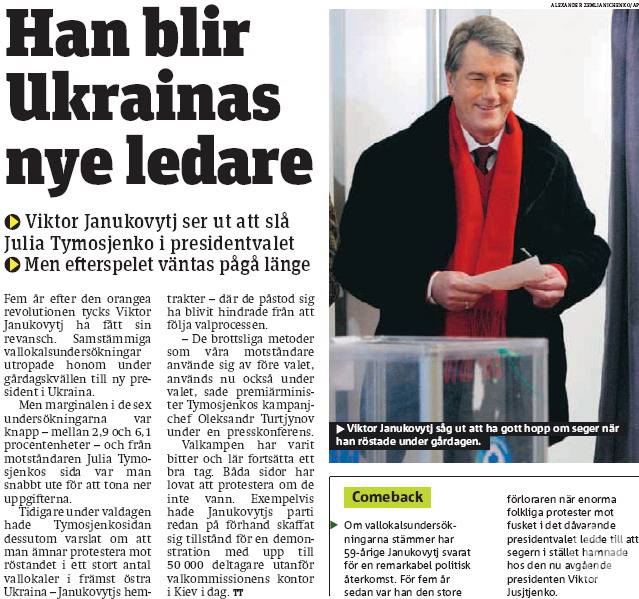 В шведской газете «Metro» 8 февраля 2010 года вышла статья о президентских выборах в Украине: ОН БУДЕТ НОВЫМ ЛИДЕРОМ УКРАИНЫ.