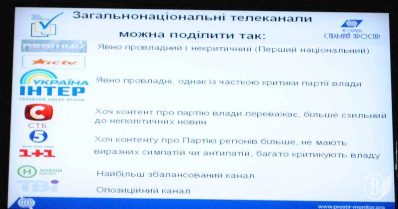 Більшість провідних телеканалів (1+1, Новий канал, 5-й канал) не проявляють виразних симпатій до правлячої партії. У своїх новинах вони вказують на дії влади, але вдаються до критики.