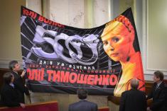 На плакаті зображена колишній прем'єр-міністр Юлія Тимошенко і написано: «500 днів ув'язнення лідера української опозиції Юлії Тимошенко».