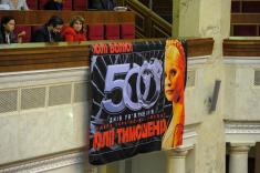 Їм не вдалося його прилаштувати у залі Парламенту. Тоді плакат перемістили в ложу помічників народних депутатів і розвісили там.