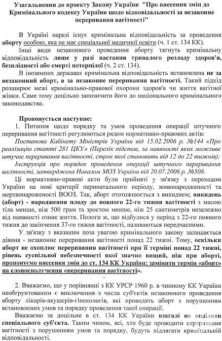 Також у документі пропонується у фразі "незаконне проведення аборту, якщо воно спричинило тривалий розлад здоров'я, безплідність або смерть потерпілої…" замінити слово "безплідність" на "тяжкі наслідки".