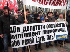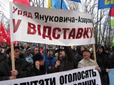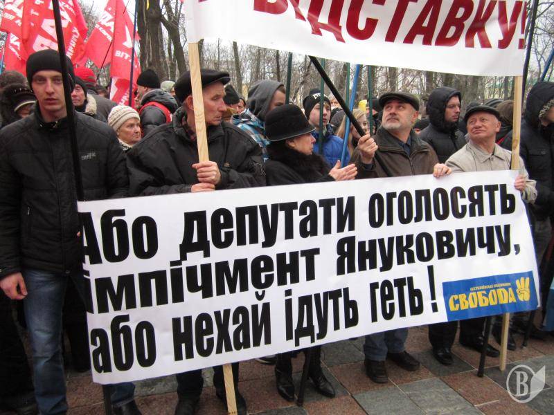 Учасники тримають гасла: «Уряд Януковича-Азарова у відставку!», «Або депутати оголосять імпічмент Януковичу, або хай ідуть геть!», «За соціальне та національне визволення» та інші.