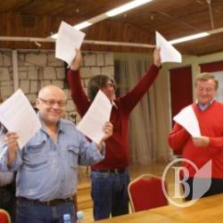 На фото: (Слева направо) Юрий Луканов, Кшиштоф Сковроньский и Олег Наливайко, председатели журналистских организаций Украины и Польши, демонстрируют подписанную на украинском и польском языках «Декларацию о сотрудничестве»