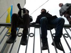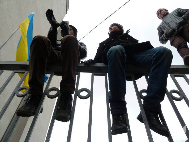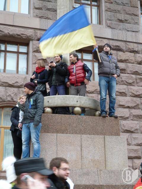 Участники "взятия" настойчиво предлагали всем гражданам заходить внутрь здания, мирно настроенные участники Европлощади в свою очередь назвали их провокаторами.