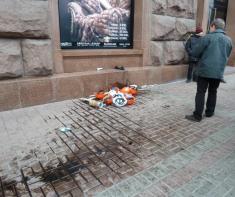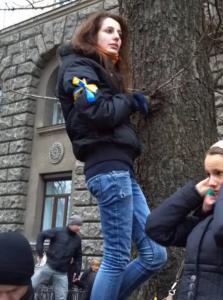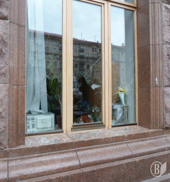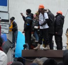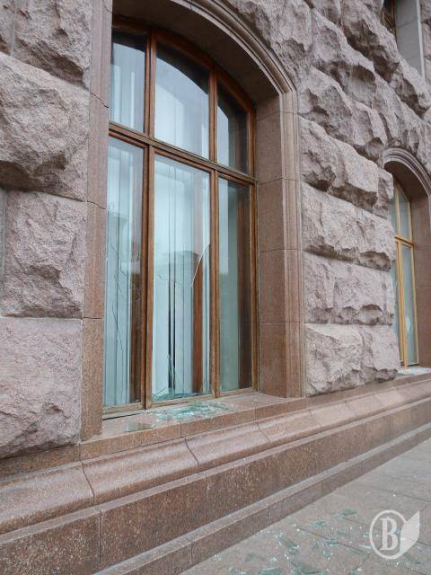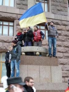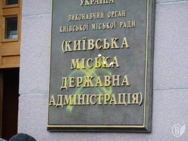 А вот Киевскую горгосадминистрацию и совет охраняли хуже - молодые люди в строительных касках с закрытыми лицами ее штурмовали. Правда немножко разлили на мостовую зажигательную смесь.