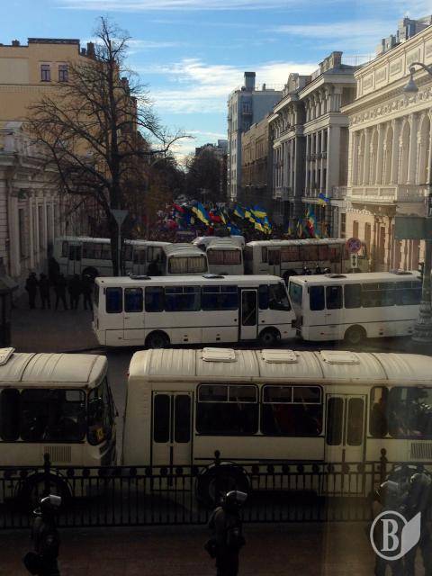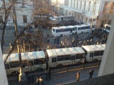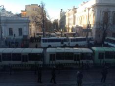 Улицы перегорожены плотно подогнанными друг к другу автобусами. Милиции чрезвычайно много.