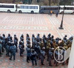 Беркут около совета формируется в колонны, держит палки наготове. По информации журналистов среди бойцов"Беркута"есть силовики из антитеррористического отряда из Крыма.
