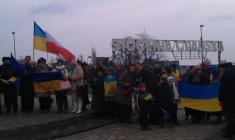 Люди держали лозунги"Украина - это Европа","Украина, вставай!","Мы за евроинтеграцию".