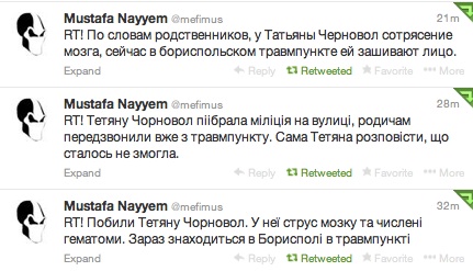 "По словам Татьяны Черновол, она возвращалась к себе в село Гора, когда заметила за собой слежку. Она резко повернула обратно к Борисполю. Но машина начала ее прижимать. После чего ее машину несколько раз ударили кузовом. Она остановилась. Из машины выбежали двое, разбили стекло. Она выскочила из машины и попробовала убежать. Ее догнали и били. Били двое мужчин ", - написал Мустафа.