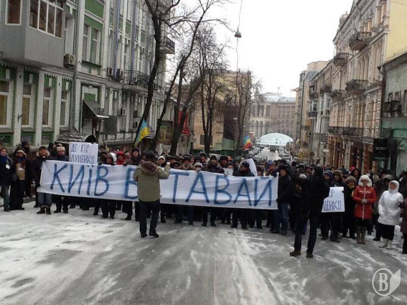 Потім колона рушить до СБУ (вул. Володимирська, 35), яка, як і МВС, досі мовчить. «Вони не контролюють ситуацію в місті або є співучасниками злочину!» - заявляють активісти Громадського сектору Євромайдану та Демократичного альянсу. «Якщо ми будемо мовчати - нас переловлять по одному» — переконані активісти.